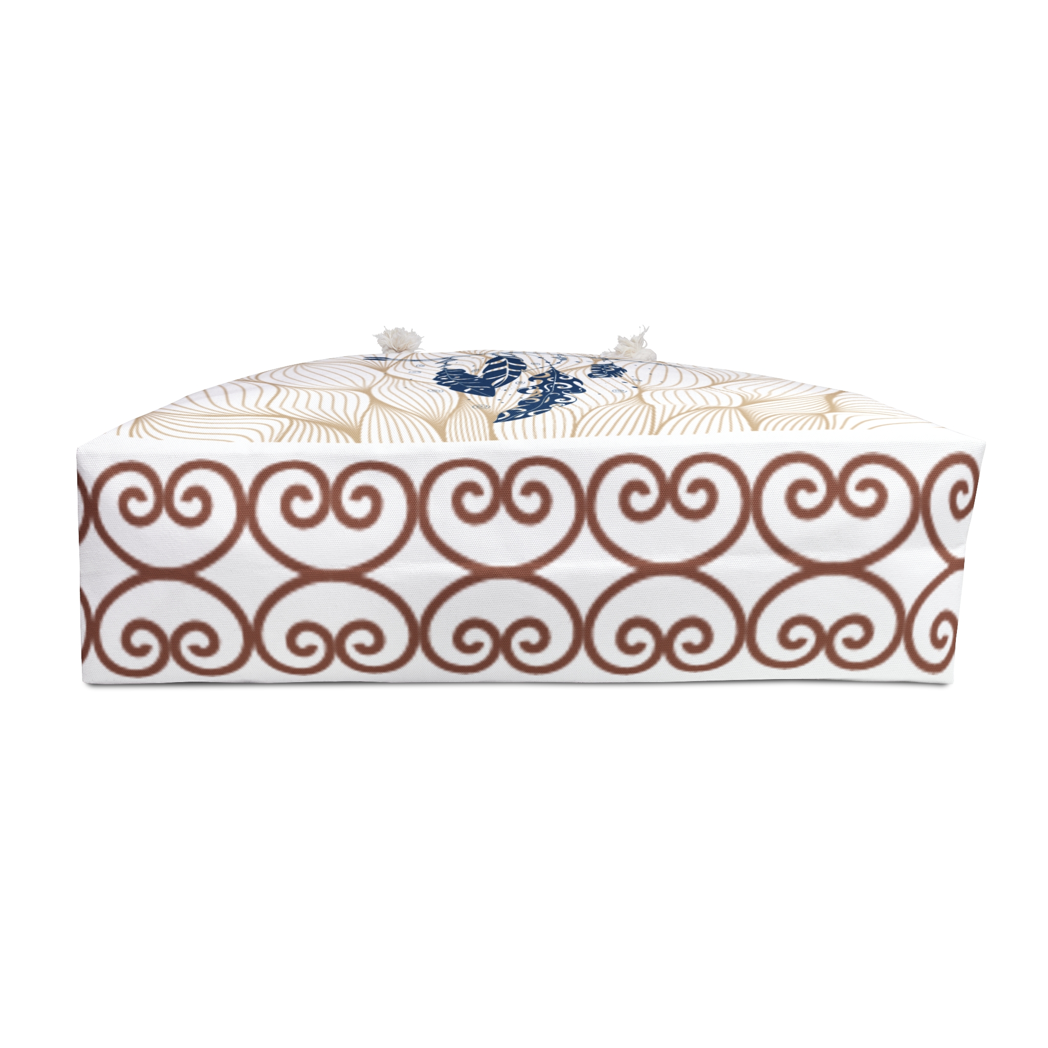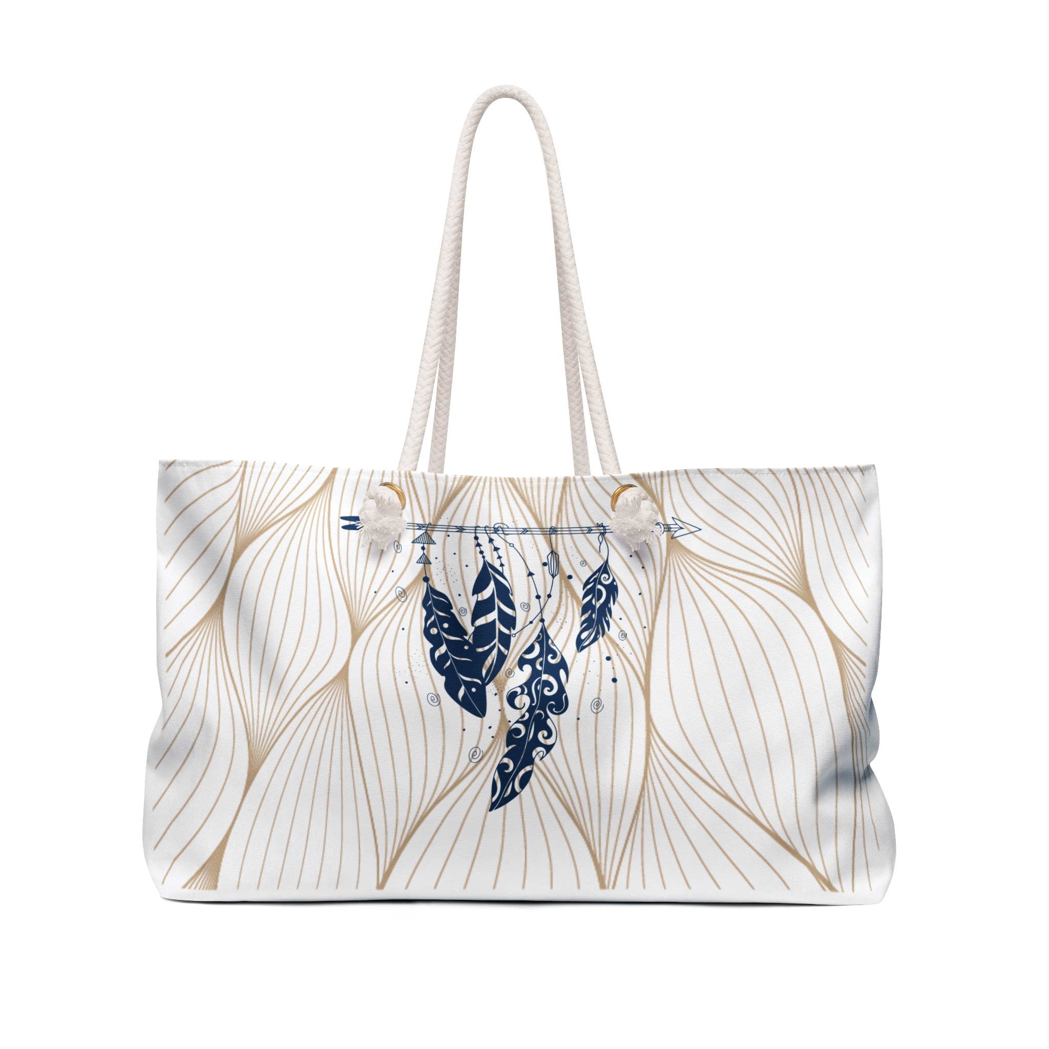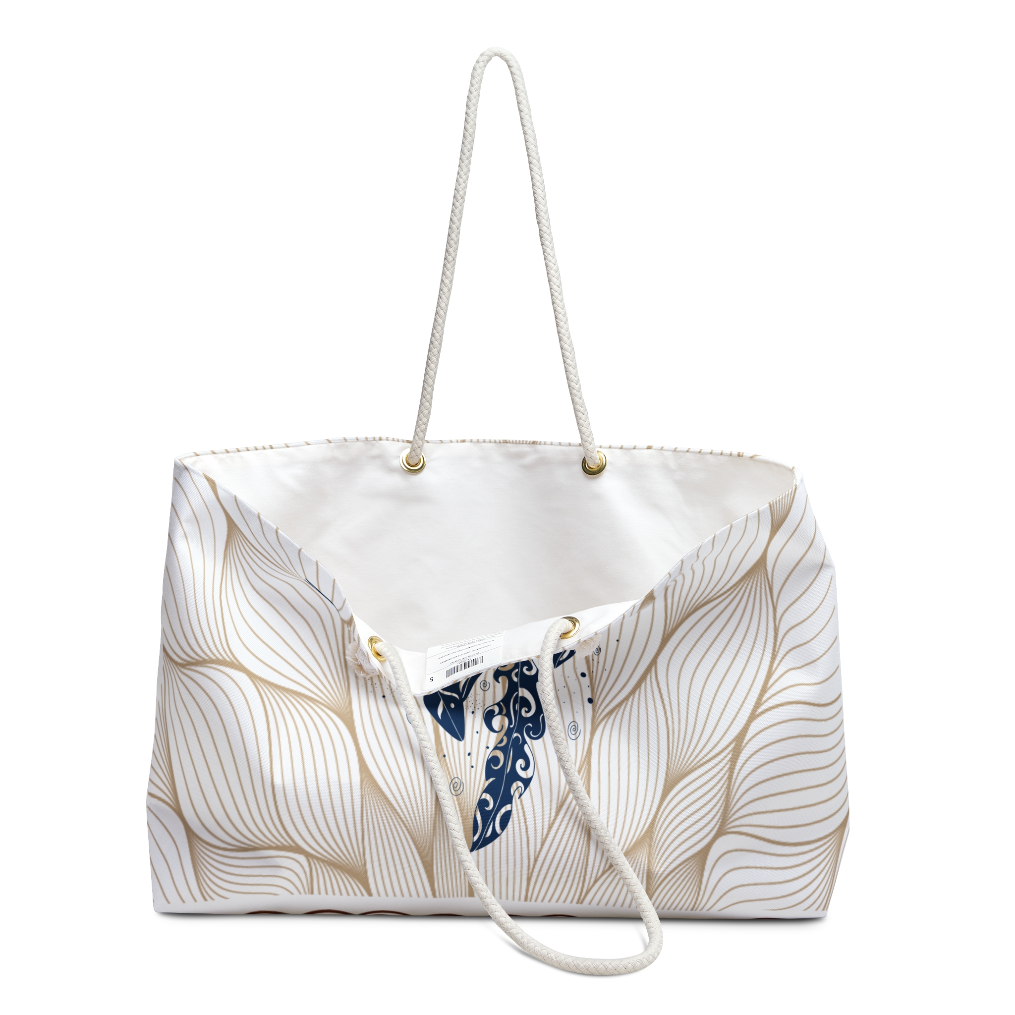 Light and airy, this roomy weekender carries a calm, tactile elegance wherever you go. The soft cream-and-white design reads like woven petals or rippling fabric — subtle, sculptural, and quietly luxurious. The roomy 24″ × 13″ body swallows a weekend’s worth of layers, a travel kit, and a well-loved book, while cream rope handles sit comfortably on the shoulder. Inside, a smooth cotton-poly lining keeps contents protected and easy to arrange. It’s the kind of bag you reach for when you want travel to feel relaxed and considered — beach mornings, slow train rides, or a minimalist city escape.